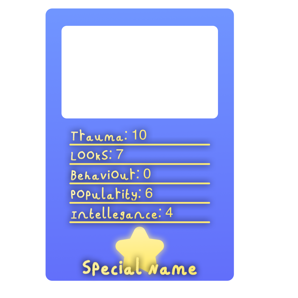 Misfit TCG is a card game similar to top trumps, the game would feature a base roster of 15 or so cards and players would bring three final cards and a support card. The three final cards are used once you run out of cards and discarded once lost, these would be gathered via opening card packs/trading. The support card would bring an ability able to use at any point/ an ability that affects the game over time.
